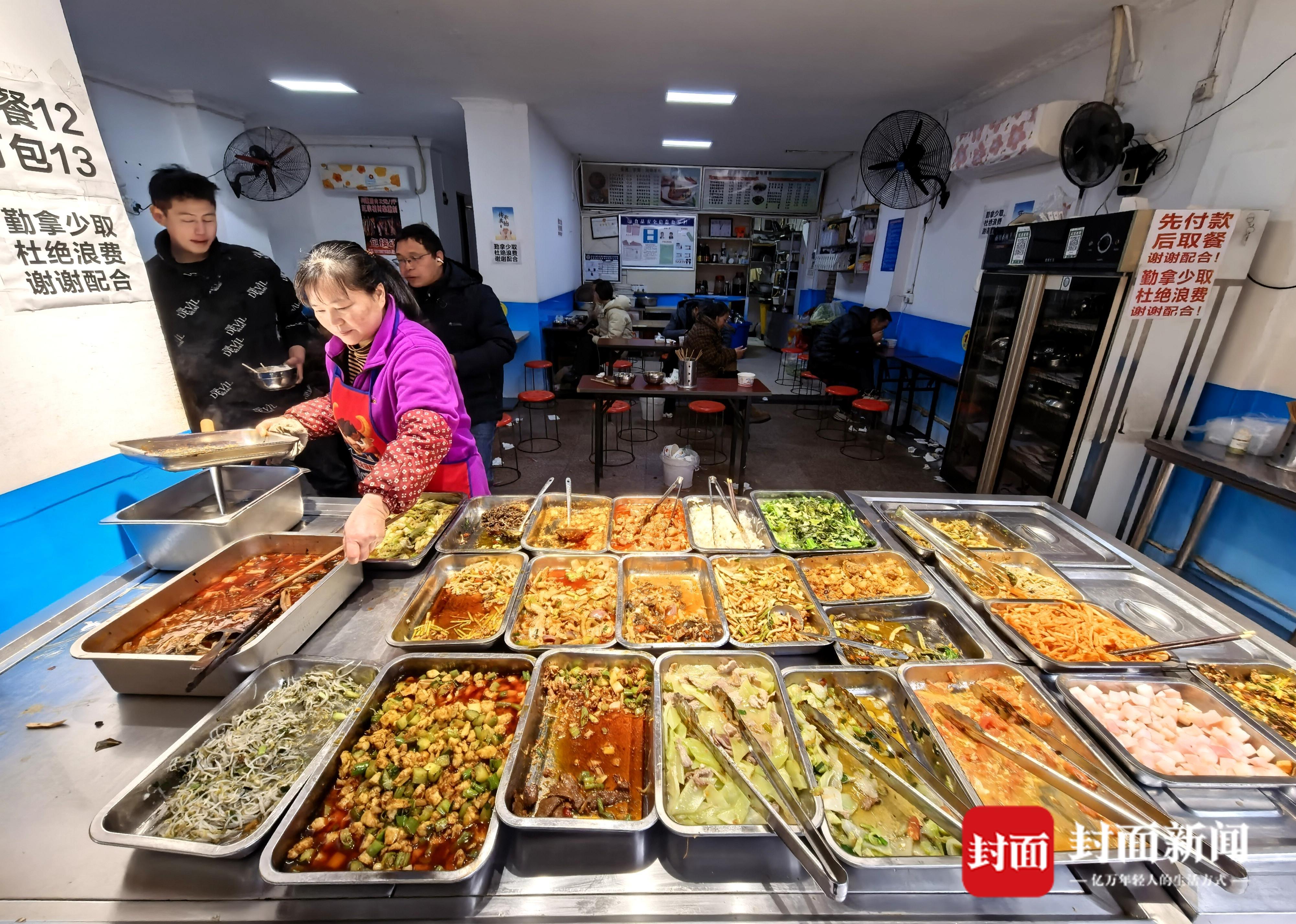 上午十点,忙活了一上午的小店会准时开门。厨房里,妻子把铁锅烧得通红,菜籽油入锅,食材翻炒“滋啦”作响,浓郁的“锅气”漫出,勾得路人频频回头——虎哥则在门口揽客:12元,20多个菜,随便吃!