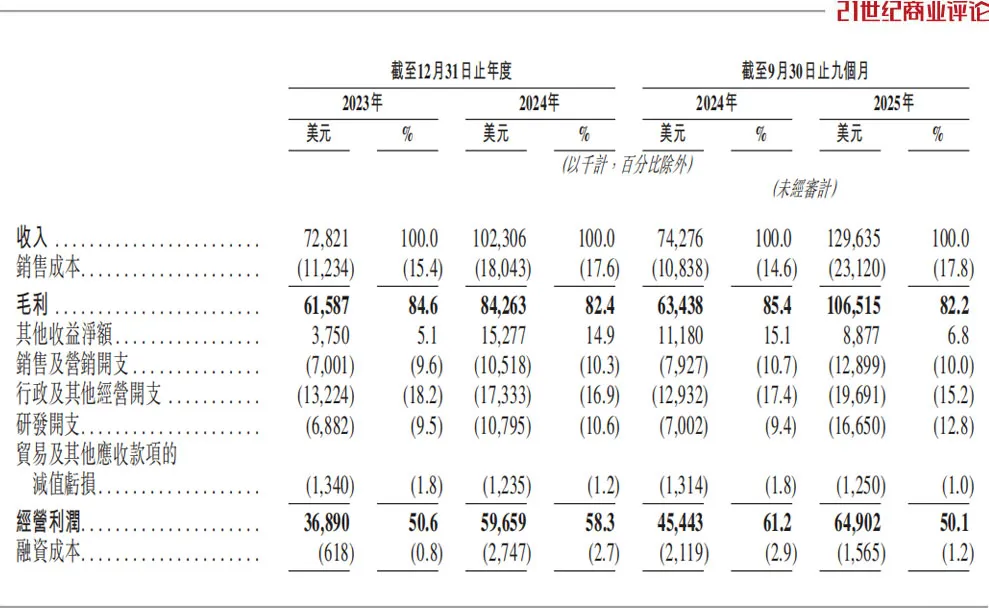 2025年1-9月,公司营收1.3亿美元,约合人民币9亿元,同比增长74.5%,毛利率82.2%。