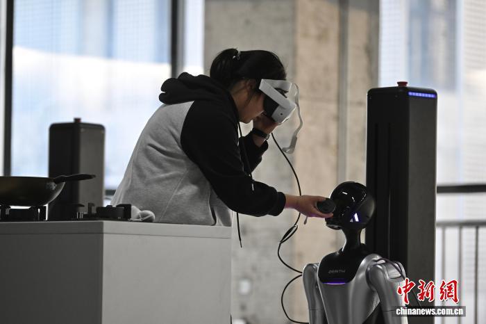 1月8日,在安徽合肥零次方机器人数据采集中心,身为“老师”的机器人数据采集员带领机器人“学生”进行场景实操训练。中新社记者 韩苏原 摄