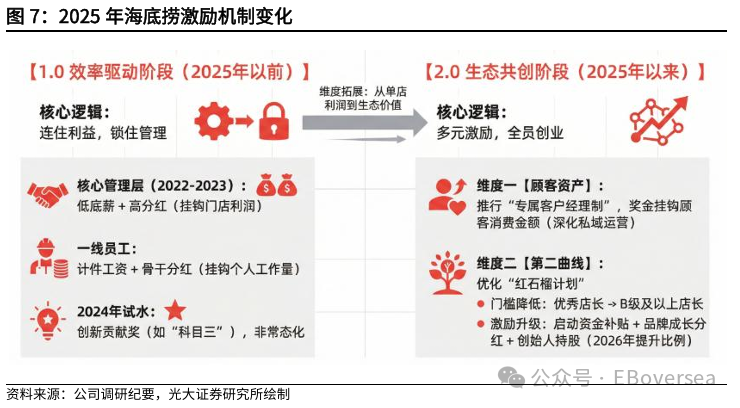 海底捞最核心的资产是人,充分调动员工积极性是公司的重要课题。海底捞的激励考核是“收放循环”的过程:1)放(2022年以前):初期通过“三级分红”极度放权,驱动扩张。2)收(2022-2023年):危机后通过“低底薪高分红+强数据考核”收紧管理,强调质量和利润。3)再放(2024-2025年):通过区域化、多管店、创业股权,在可控框架下再次激发一线活力。4)平衡(2025年至今):寻求数据化管理与人性化关怀的平衡,回归文化本源。