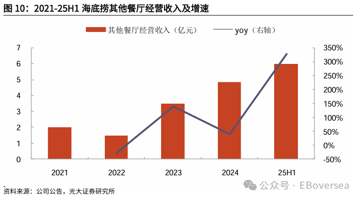 副品牌收入体量尚小但增速远超主业:2021年海底捞其他餐厅经营收入约2亿元,收入占比约0.5%;25H1其他餐厅经营收入已达5.97亿元,同比+227%,占总营收比例升至2.9%。