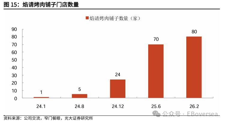 焰请烤肉铺子:扩张放缓,短期聚焦单店质量。“焰请烤肉铺子”是海底捞“红石榴计划”的标杆品牌,截至26年2月,门店数量达80家,自25H2进入模型优化期、扩张节奏放缓阶段。在“焰请烤肉铺子”的经验帮助下,“红石榴计划”下其他品牌有望更快找到适合的发展模式;“焰请烤肉铺子”在调整完成后也有望重新进入扩张阶段。