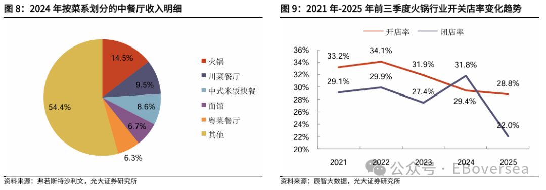 2024年火锅赛道在中餐中的收入占比约14.5%,仍是最大细分餐饮品类;火锅连锁化率高,2024年为43.9%,远高于餐饮行业的22.6%。但火锅行业竞争主体多且迭代剧烈,2024年按收入的CR5仅约8.1%。2022–2023年及2025年前三季度火锅行业处于净关店状态,大量中小参与者出清,头部品牌凭借供应链与资金优势份额有所提升,但单一品类的市场规模天花板与周期波动已经显现。