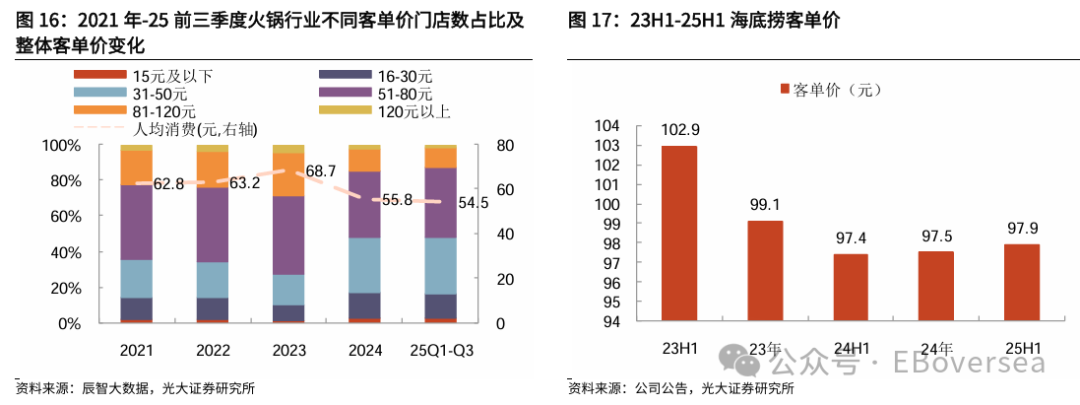 海底捞客单价已于24H2率先止跌回升。火锅行业自24年起客单价逐步下滑,25年前三季度,行业客单价仍处于下跌趋势。海底捞客单价自24H2起企稳回升,随后价增趋势延续,25H1整体客单价为97.9元,同比略有提升(24H1为97.4元)。
