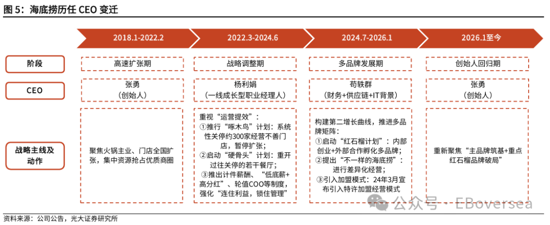 l张勇二期(2026年1月至今):战略中心正在从单纯降本增效,加快转向在守住基本盘前提下的聚焦突破。主品牌侧:从“谨慎开店+翻台守底线”,逐步转向“在翻台企稳基础上的净开店+一店一策场景化改造”(夜宵店、亲子店、鲜切主题店等),结合加盟“老店+新店”模式,重新打开成长空间。多品牌侧:“红石榴计划”从“多点试错、广撒网”,转向优先扶持少数标杆品牌,并引入外部并购,减少资源分散和管理稀释风险。