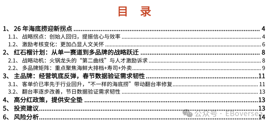 2026年初海底捞站在“二次创业”的战略拐点:创始人张勇回归、红石榴多品牌从“试错”走向“深耕”阶段、叠加高分红策略,使公司从早期的“火锅成长股”转型为“主业修复+第二曲线培育+高股息防御”的配置标的。2025年上半年主品牌翻台率和利润短期承压,但下半年高频经营数据已显示底部企稳迹象,在创始人重新执掌下,有望通过组织再造与数字化赋能,重塑单店模型与增长路径。