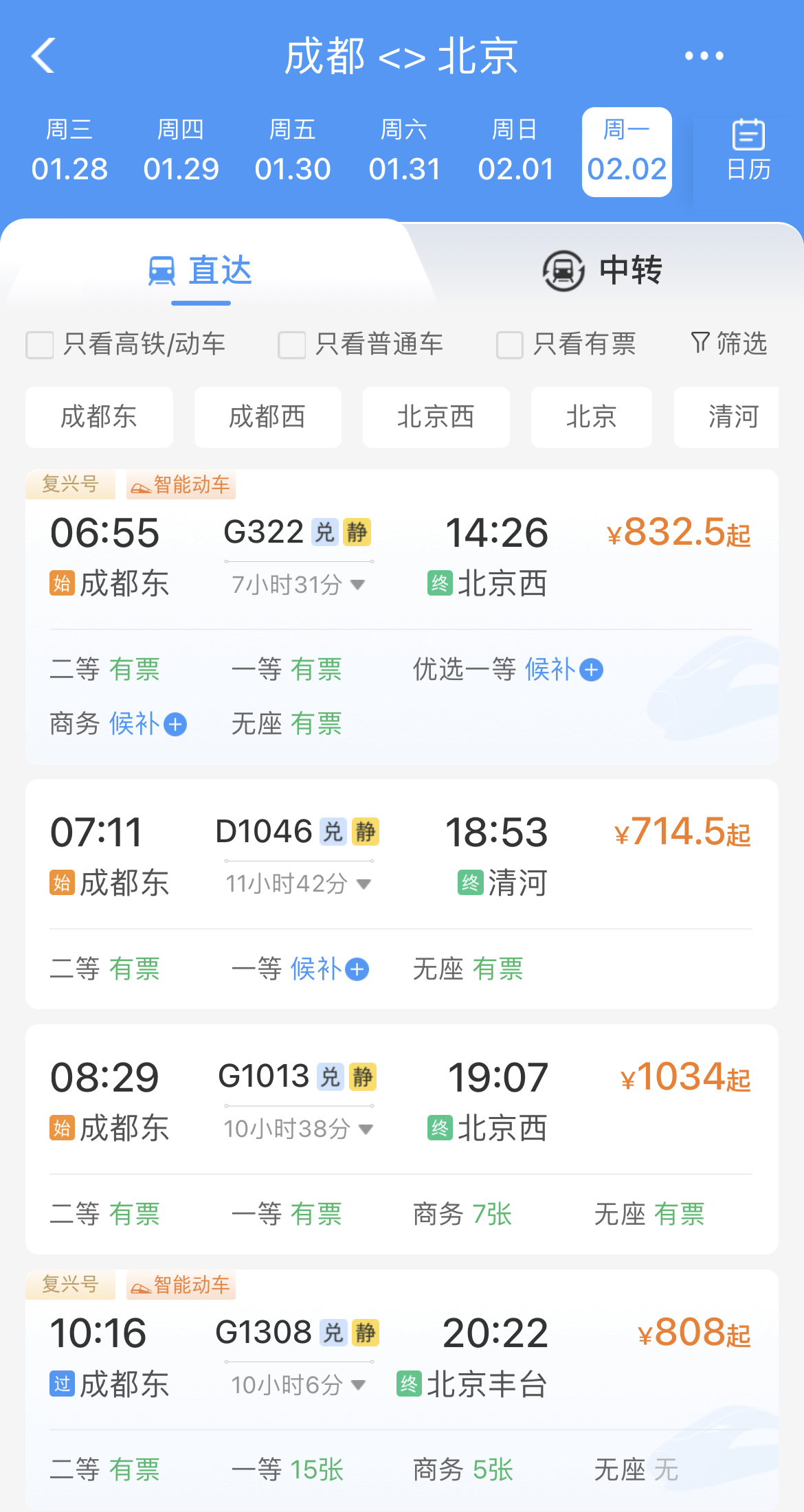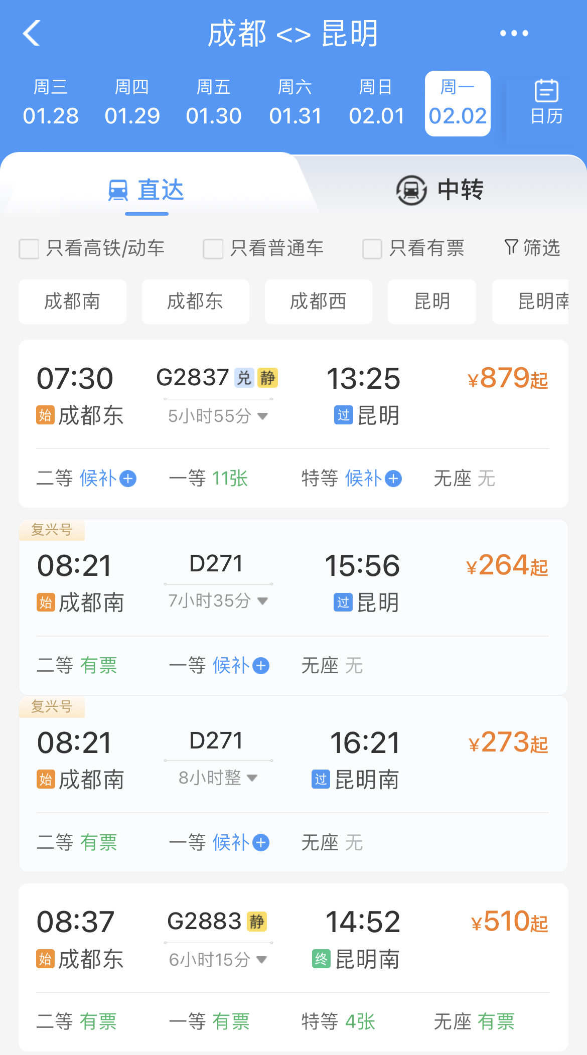 成都车站工作人员介绍,省外方面,北京、昆明、贵阳是春运首日出行热门方向。记者查询发现2月2日当天,成都东至北京西G322次、G1592次列车的部分席位已售罄;成都至昆明G2837、G2851、D271等多趟列车部分席位售罄。