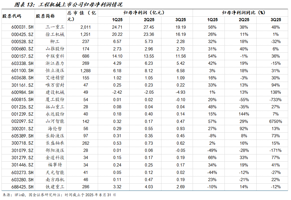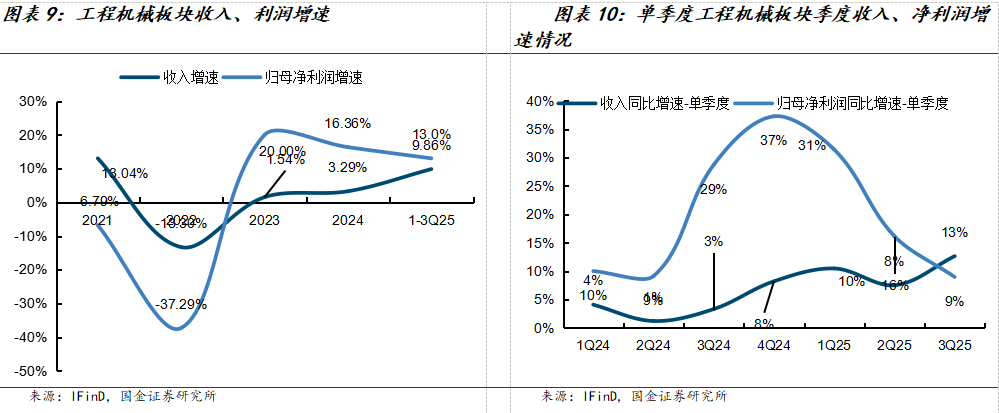 1-3Q25工程机械行业营收同比+9.86%;归母净利润同比+13%;单三季度看,工程机械行业营收同比+13%;归母净利润实现同比+9%。