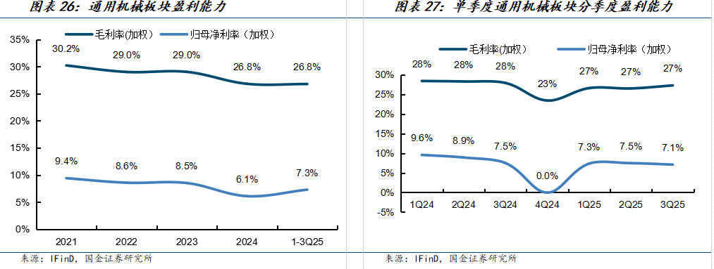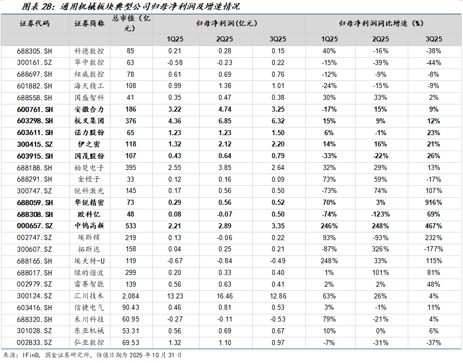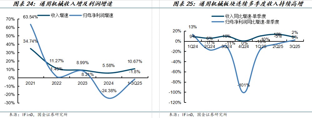 通用机械:需求温和复苏、盈利能力有所下滑。通用机械需求主要来自制造业,需求属性主要跟宏观经济高度相关,25年通用机械行业需求温和复苏、但竞争激烈。单三季度,通用机械行业收入同比+8%;由于竞争激烈,归母净利润同比+2%,连续5个季度首次转正。其中,刀具板块实现较大拐点,叉车、注塑机、减速器维持稳健增长。