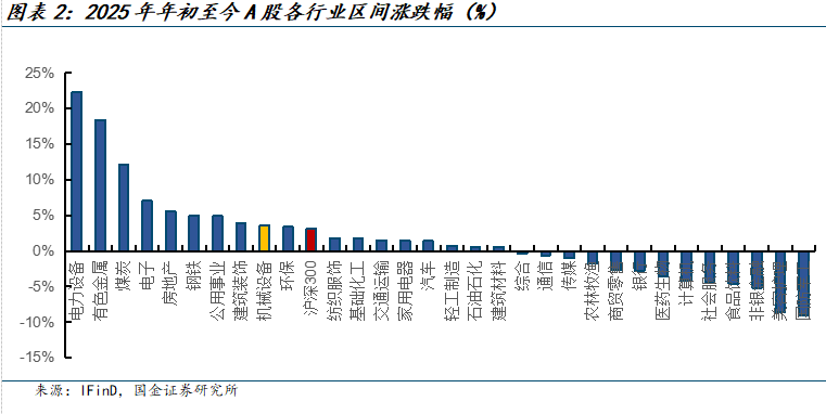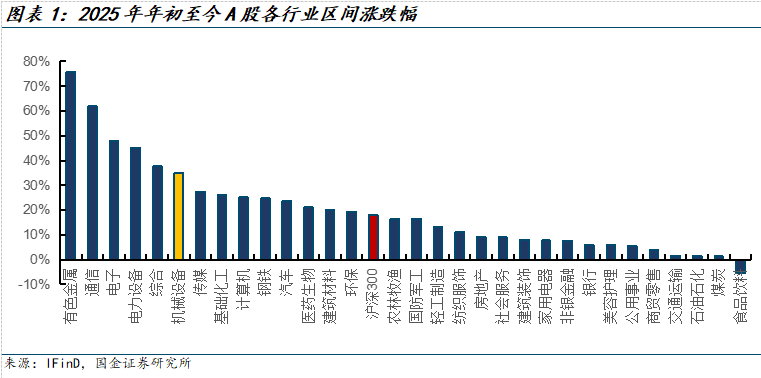 2025年年初至今,申万机械行业绝对收益35%,跑赢沪深300指数,相对收益17.13%。机械行业在申万31个行业中排名第6。