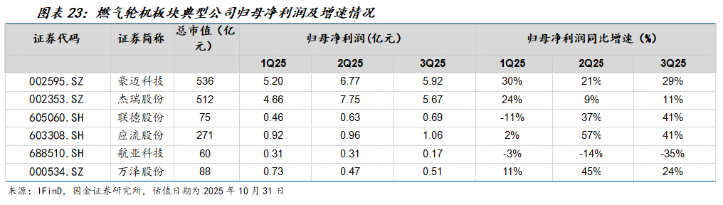 燃气轮机:全球需求景气上行,国产产业链加速国产替代。燃气轮机作为AI数据中心未来稳定的电力来源,在全球AI资本开支加速放量下,需求景气度快速上行。叠加中国燃气轮机加速国产替代,燃气轮机产业链需求快速增长。全球需求景气上行,国产产业链加速国产替代。3Q25燃气轮机板块收入同比+18%;归母净利润同比+21%。核心产业链公司应流股份、联德股份单三季度实现归母净利润增速分别为同比+41%、+29%。