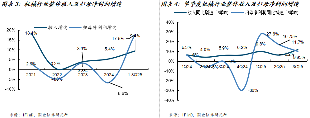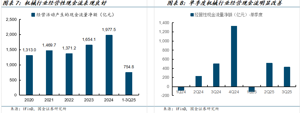 总体:需求温和复苏。(1)样本统计来自申万分类的申万机械设备行业以及申万国防军工共595家公司。1-3Q25,机械行业实现收入16810亿元、同比增长9.4%;实现归母净利润1164亿元,同比增长17.5%。单三季度,机械行业实现收入6004.9亿元、同比增长11.7%;实现归母净利润365.6亿元,同比增长9.9%。机械行业业绩逐季度看,收入呈现稳健提升趋势。逐季度看,收入呈现稳健提升趋势。(2)从盈利能力看,1-3Q2025机械行业综合毛利率22.3%,较24年提升0.1pct;归母净利率6.9%,较24年提升1.6pct。单三季度,机械行业综合毛利率22%,归母净利率6.9%,总体保持稳健。(3)机械行业整体现金流情况良好,3Q25经营性现金流量净额为426.9亿元,同比+128%。