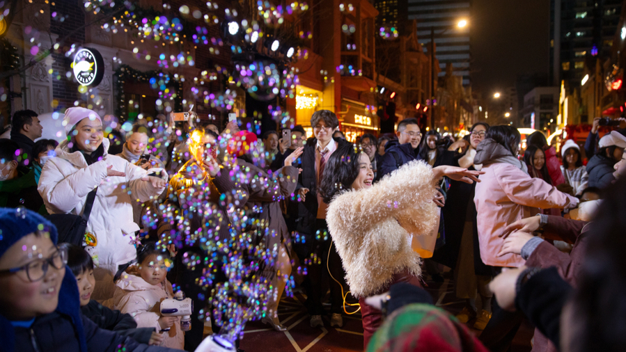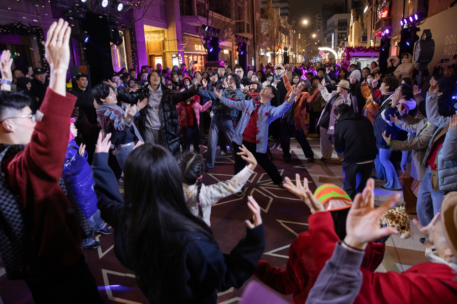 上海张园携手上海国际舞蹈中心剧场,联袂发起“百人共舞”。随着探戈、爵士、摇摆舞及街舞等多元舞蹈表演轮番登场,舞者的热情与现场梦幻的“飘雪”装置共同驱散了冬夜寒意,与现场观众的即兴互动与舞蹈教学将街区的迎新氛围推向高潮。